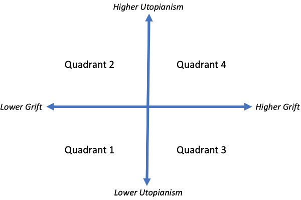 人们目前还不清楚这些乌托邦式项目的追求是否会成功,但风险投资公司只需要其中几个项目成功就可以了,因为成功项目的盈利可以弥补所有失败项目的亏损。这种做法里有一点就是要让第二象限的项目看起来尽可能的像是第一象限的项目,因为这样子会使得项目表面的风险降低,令投资者感觉更好。在这个过程中,具有突破性的真正要求往往被人为掩盖了,项目所提出的设计不断被重申为完全可行,并且在博弈论和机制设计的角度表现出完全的激励性。第二象限的项目类似于第一象限项目,但它是高风险、高回报。二者在风险方面有不同,但在潜在的回报方面没有不同。