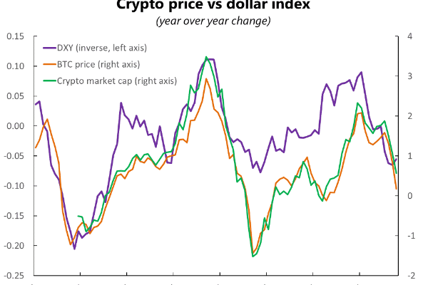 但更重要的是,美元价值是许多宏观因素的风向标,从全球风险偏好到货币条件到增长前景再到中央银行的行动,所有这些都会影响加密货币。