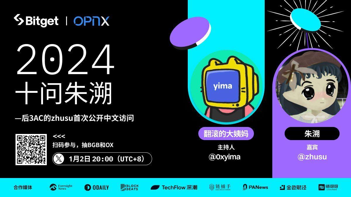 Bitget 将联合OPNX举办主题为“后3AC的zhusu首次公开中文访问—2024十问朱溯”的线上活动,主持人翻滚的大姨妈,嘉宾朱溯。
