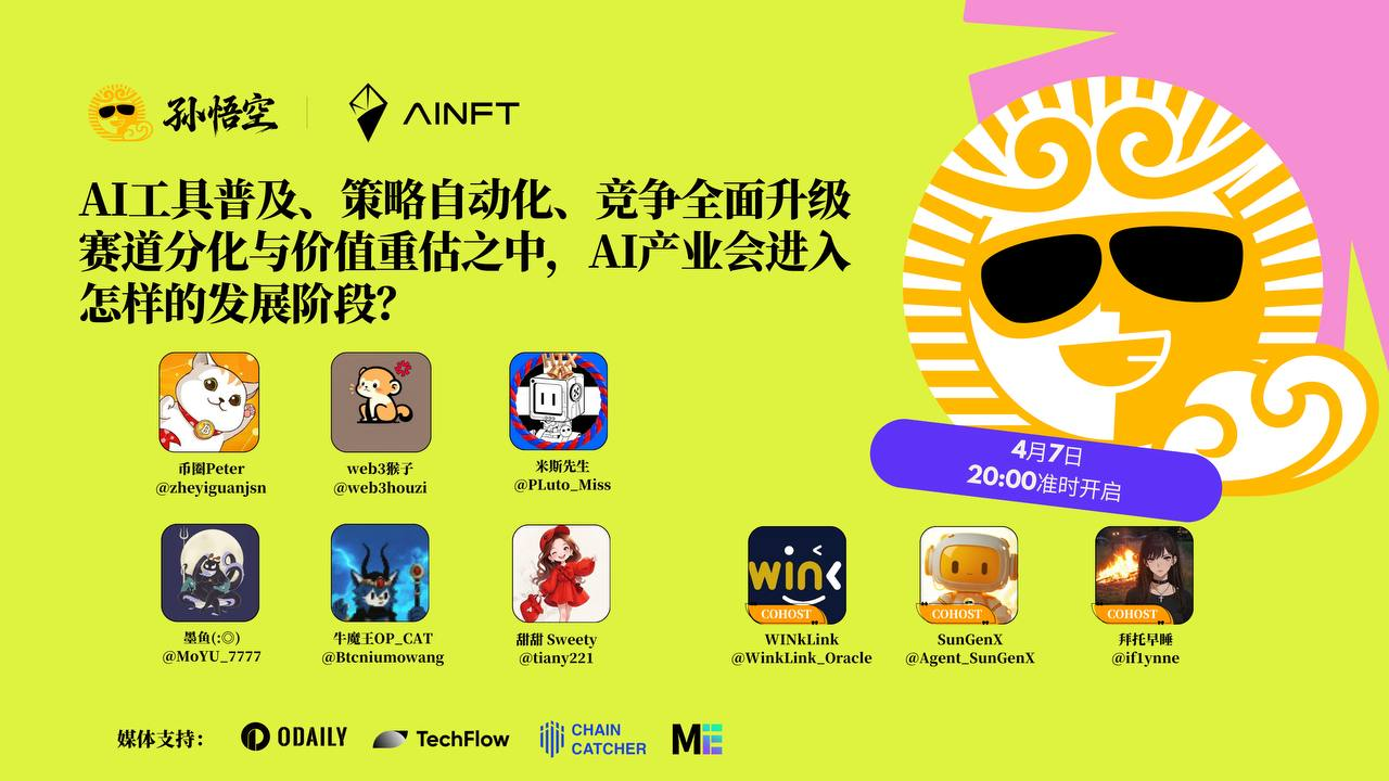 孙悟空生态将于 4月 7 日晚 8 点在 X Space 举办主题为“AI 工具普及、策略自动化、竞争全面升级——赛道分化与价值重估之中,AI 产业会进入怎样的发展阶段?”的深度圆桌讨论。