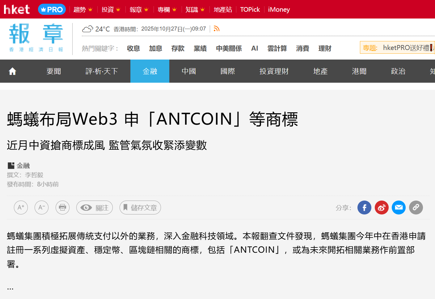 深潮 TechFlow 消息,10 月 27 日,据香港经济日报报道,蚂蚁集团今年年中在香港申请注册一系列虚拟资产、稳定币、区块链相关商标,包括"ANTCOIN"。