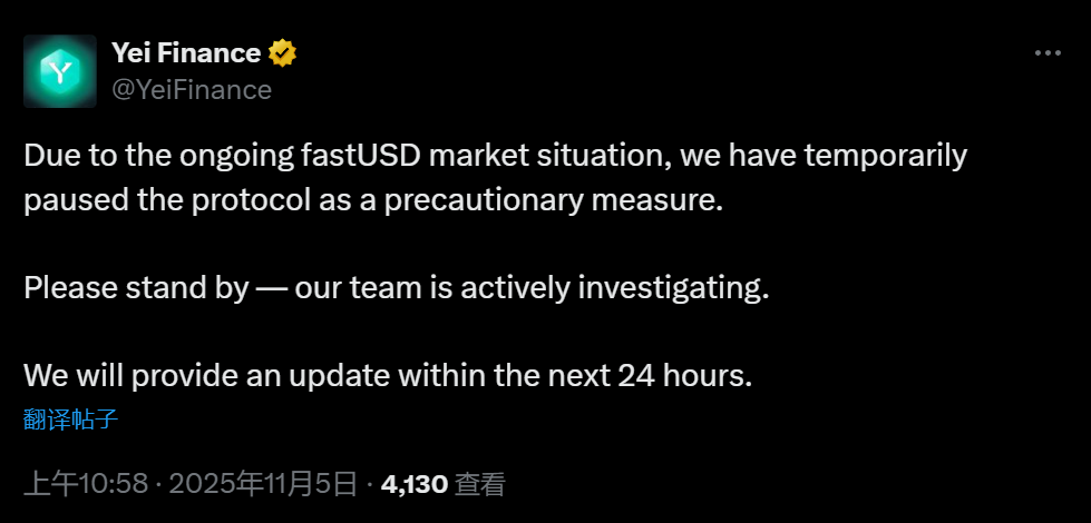 深潮 TechFlow 消息,11 月 5 日,Sei 生态 DeFi 协议 Yei Finance 宣布,由于当前 fastUSD 市场出现异常情况,团队已暂停协议以采取预防措施。团队正在积极调查中,预计将在未来 24 小时内提供更新。
