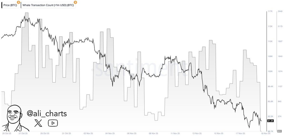 深潮 TechFlow 消息,11 月 20 日,据链上分析师 Ali(@ali_charts)监测,比特币网络巨鲸活动持续下降,从 10 月份每日超过 2400 笔交易降至当前仅 300 笔。