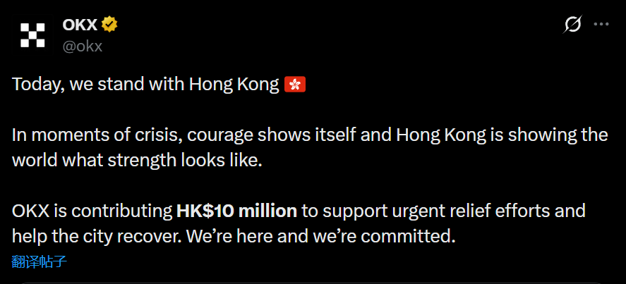 据官方消息,OKX 表示向香港捐款 1,000 万港币,用于支持当地紧急救援和灾后恢复相关工作。