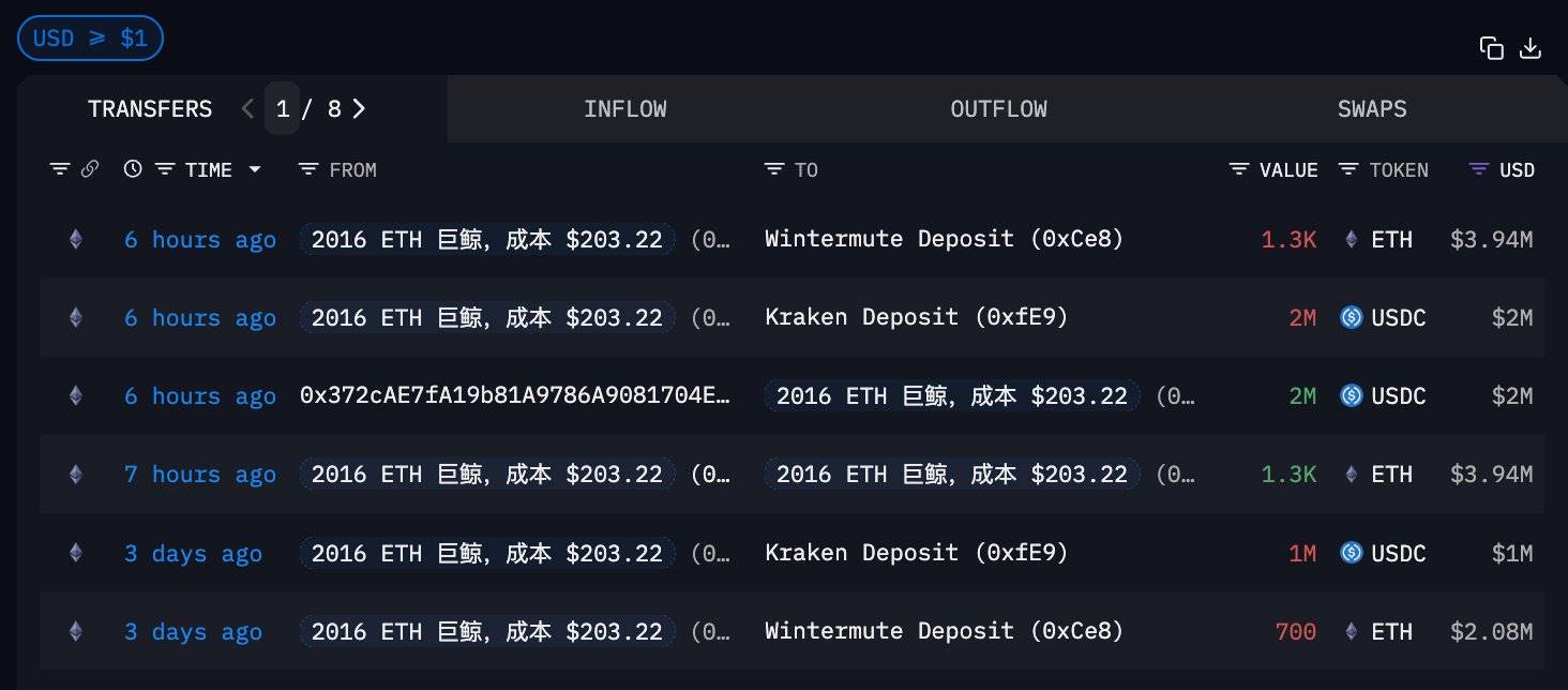 深潮 TechFlow 消息,11 月 28 日,据链上分析师 Ai 姨(@ai_9684xtpa)监测,成本低至 203.22 美元的 2016 年以太坊远古巨鲸疑似通过 Wintermute 再次抛售 1300 ETH,价值 394 万美元。若卖出该巨鲸将获利 367.6 万美元,九年回报率 1391%。自 11 月 17 日起,该巨鲸已累计向 Wintermute 转移 6000 ETH,总价值 1816 万美元,平均充值价格 3026.77 美元。