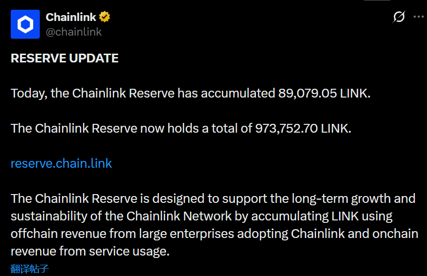 深潮 TechFlow 消息,11 月 28 日,据 Chainlink 今日凌晨发文披露,Chainlink 储备库今日新增积累 89,079.05 枚 LINK 代币。截至目前,Chainlink 储备库总持有量已达 973,752.70 枚 LINK 。