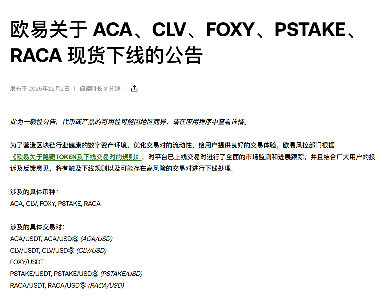 深潮 TechFlow 消息,12 月 2 日,据官方公告,OKX 将下架以下币种的现货交易:ACA, CLV, FOXY, PSTAKE, RACA。