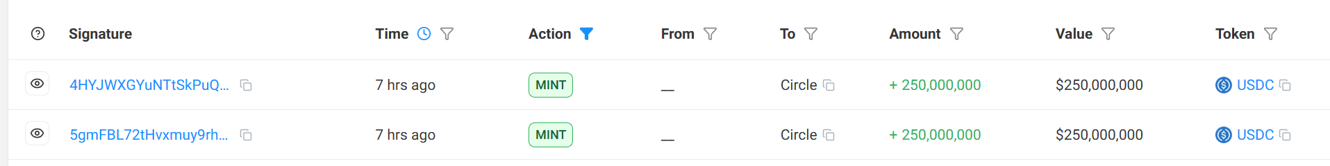 据 SolanaFloor 监测,Circle 在过去 7 小时前于 Solana 链上新增铸造了 5 亿枚 USDC。