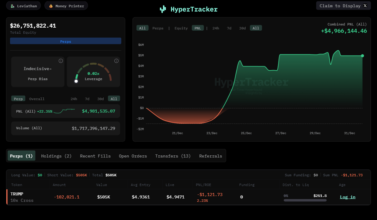 深潮 TechFlow 消息,12 月 31 日,据 Onchain Lens(@OnchainLens)监测,此前抛售 255 枚比特币的鲸鱼已开设 TRUMP 代币的 10 倍杠杆做空仓位。