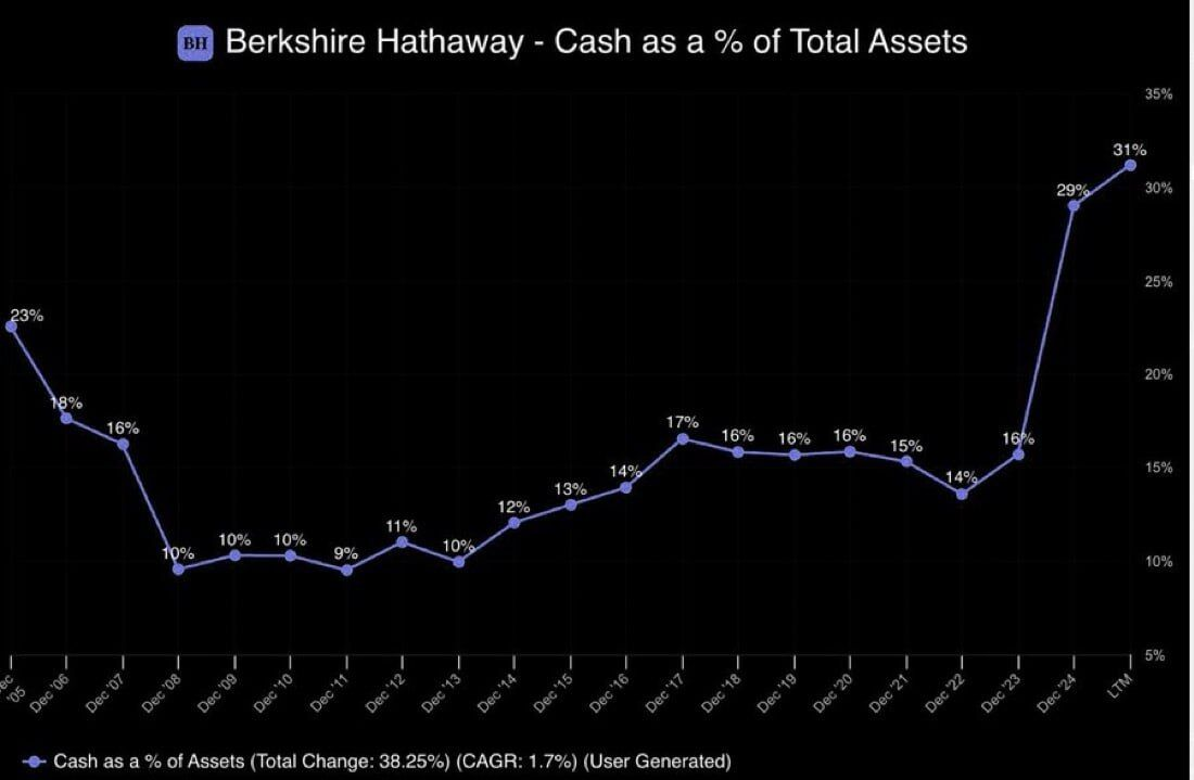 据 Cointelegraph 报道,伯克希尔·哈撒韦目前持有的现金及现金等价物占其资产总额的 31%,创下 20 多年来的最高水平。