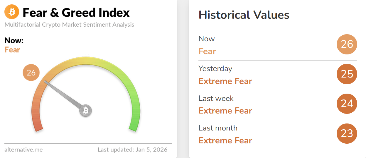 深潮 TechFlow 消息,1 月 5 日,据 Alternative.me 数据,今日加密货币恐慌与贪婪指数升至 26(昨日该指数为 25),表明市场由「极度恐慌状态」转为「恐慌状态」。