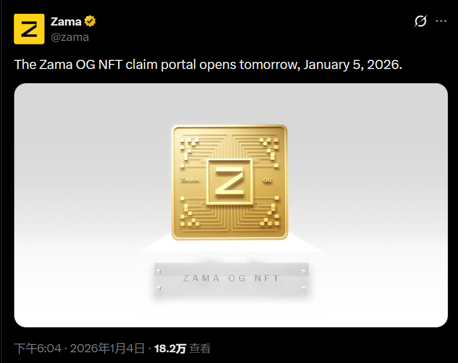 据官方公告,隐私计算项目 Zama Protocol 表示,Zama OG NFT 认领门户将于 2026 年 1 月 5 日开放。