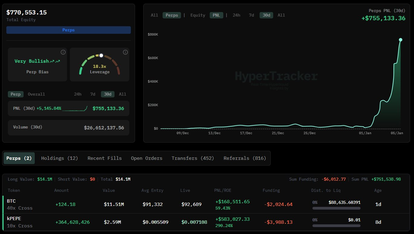 深潮 TechFlow 消息,1 月 5 日,据 Onchain Lens(@OnchainLens)监测,交易员 James Wynn(@JamesWynnReal)进一步增加了其比特币(BTC)40 倍杠杆多头仓位,同时继续持有 PEPE 币 10 倍杠杆多头仓位。目前,James Wynn 的合计持仓价值达 1400 万美元,浮动盈利超过 75 万美元。