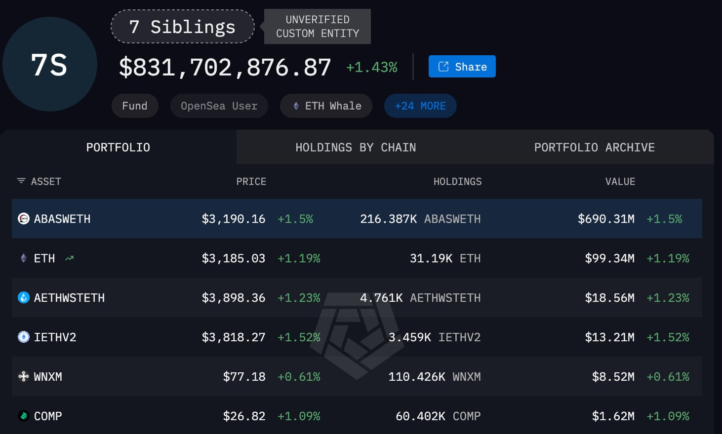 据链上分析师 Ai姨(@ai_9684xtpa)监测,"7 Siblings"自 2024 年 10 月开始以均价 3479 美元在链上累计购入 48588.72 ETH,总价值约 1.69 亿美元。 该机构目前在链上共持有 25.2 万枚 ETH(价值超 8 亿美元),算上 Trend Research 在所有机构中持仓排名第 5,超越以太坊基金会。当前 ETH 价格距离其近期建仓成本线尚有约 322 美元差距。
