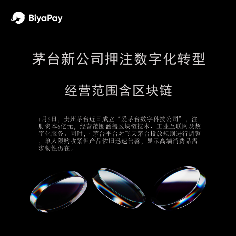 深潮 TechFlow 消息,01 月 05 日,贵州茅台近日成立“爱茅台数字科技公司”,注册资本 6 亿元,经营范围涵盖区块链技术、工业互联网及数字化服务。同时,i 茅台平台对飞天茅台投放规则进行调整,单人限购收紧但产品依旧迅速售罄,显示高端消费品需求韧性仍在。