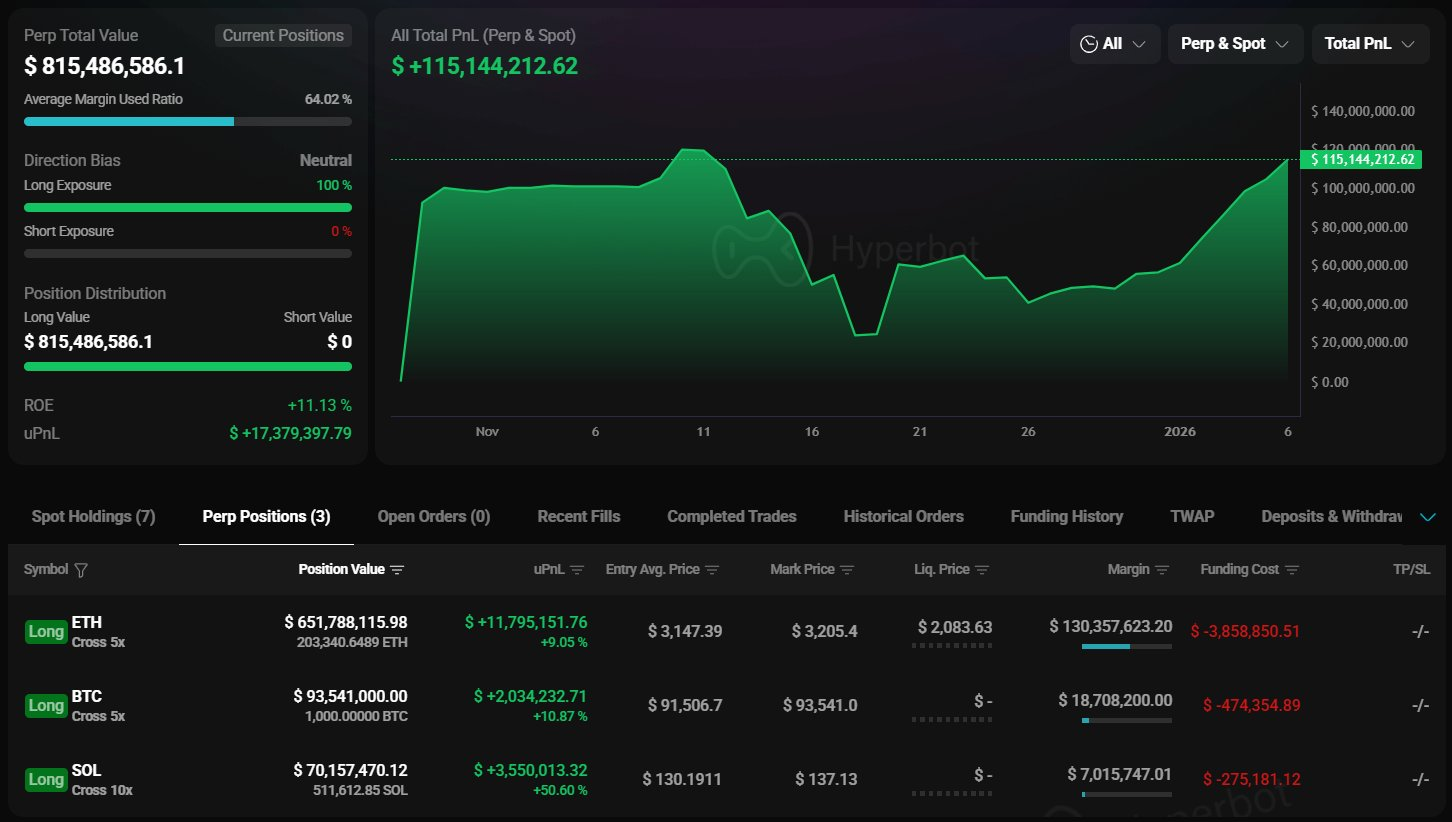该地址目前总持仓价值约 8.15 亿美元,包括 203,341 枚以太坊(价值 6.517 亿美元)、1,000 枚比特币(价值 9350 万美元)以及 511,613 枚 SOL(价值 7000 万美元)。