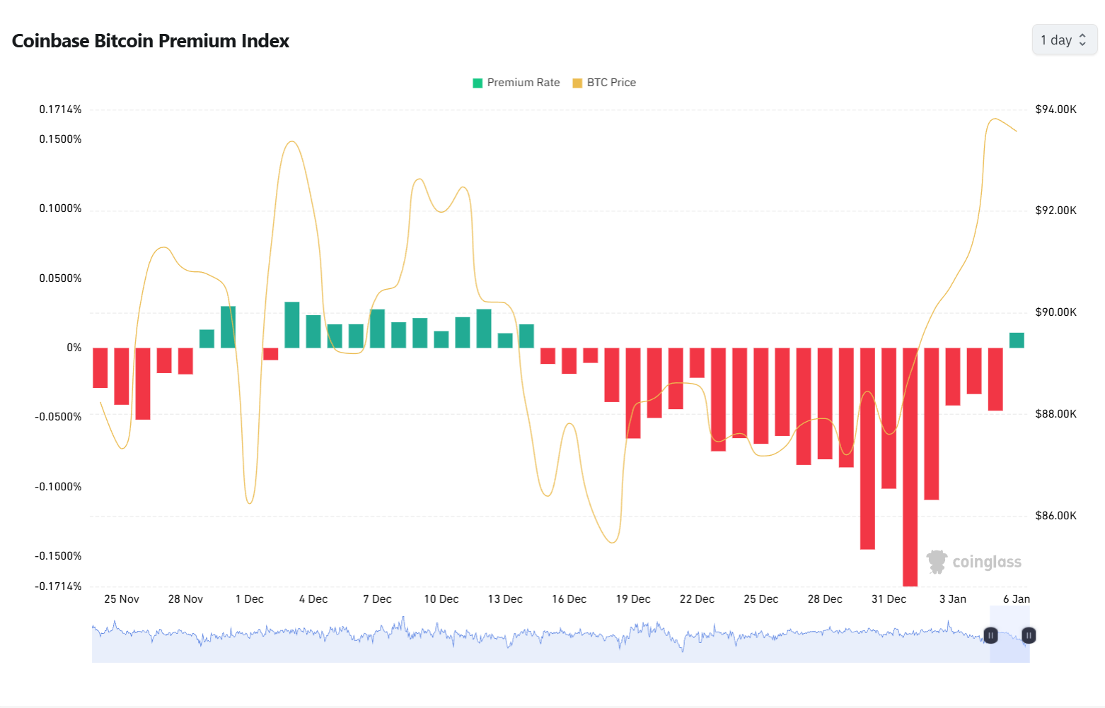 深潮 TechFlow 消息,1 月 6 日,据 Coinglass 数据,Coinbase 比特币溢价指数在连续 22 天处于负值后重新转正,当前报 0.01%,或表明美国市场资金正重新入场。