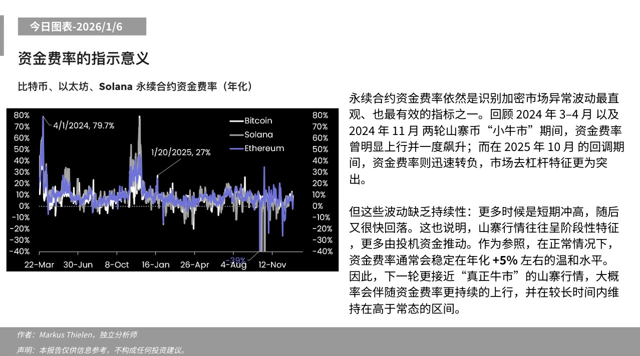 但这些波动缺乏持续性:更多时候是短期冲高,随后又很快回落。这也说明,山寨行情往往呈阶段性特征,更多由投机资金推动。作为参照,在正常情况下,资金费率通常会稳定在年化+5%左右的温和水平。因此,下一轮更接近"真正牛市"的山寨行情,大概率会伴随资金费率更持续的上行,并在较长时间内维持在高于常态的区间。”
