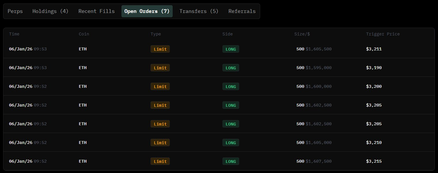 该巨鲸同时执行了 3 笔以太坊交易,快速获利 36,092 美元,随后在 3,190 至 3,215 美元价格区间内挂单做多 3,500 个以太坊(价值约 1100 万美元)。