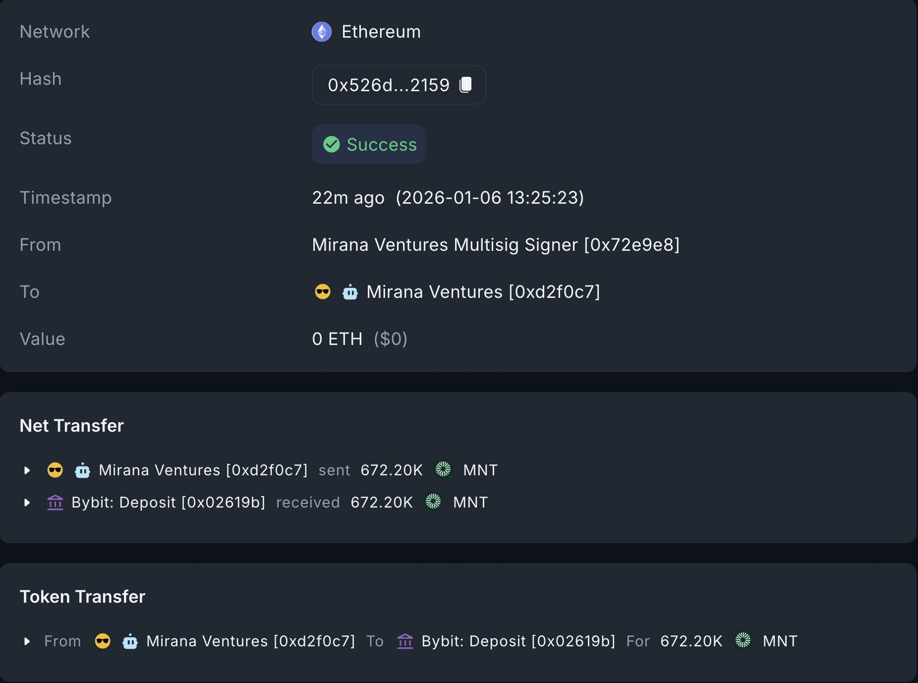 据 Nansen 监测,Mirana Ventures 向 Bybit 交易所存入了 672,204 枚 MNT(价值约 746,461.29 美元)。