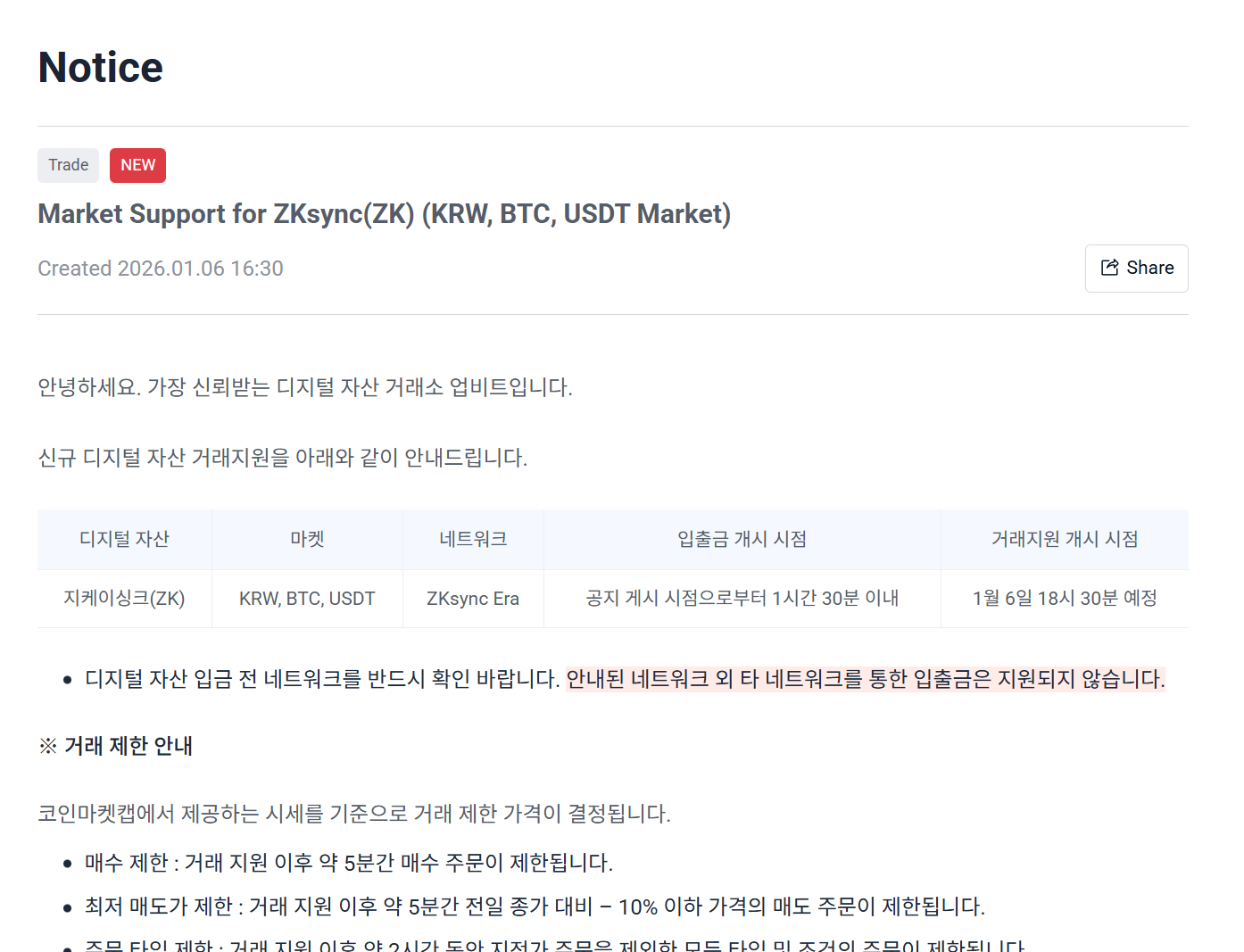 深潮 TechFlow 消息,1 月 6 日,据官方公告,Upbit 将上线 ZK 韩元、BTC 及 USDT 交易对。