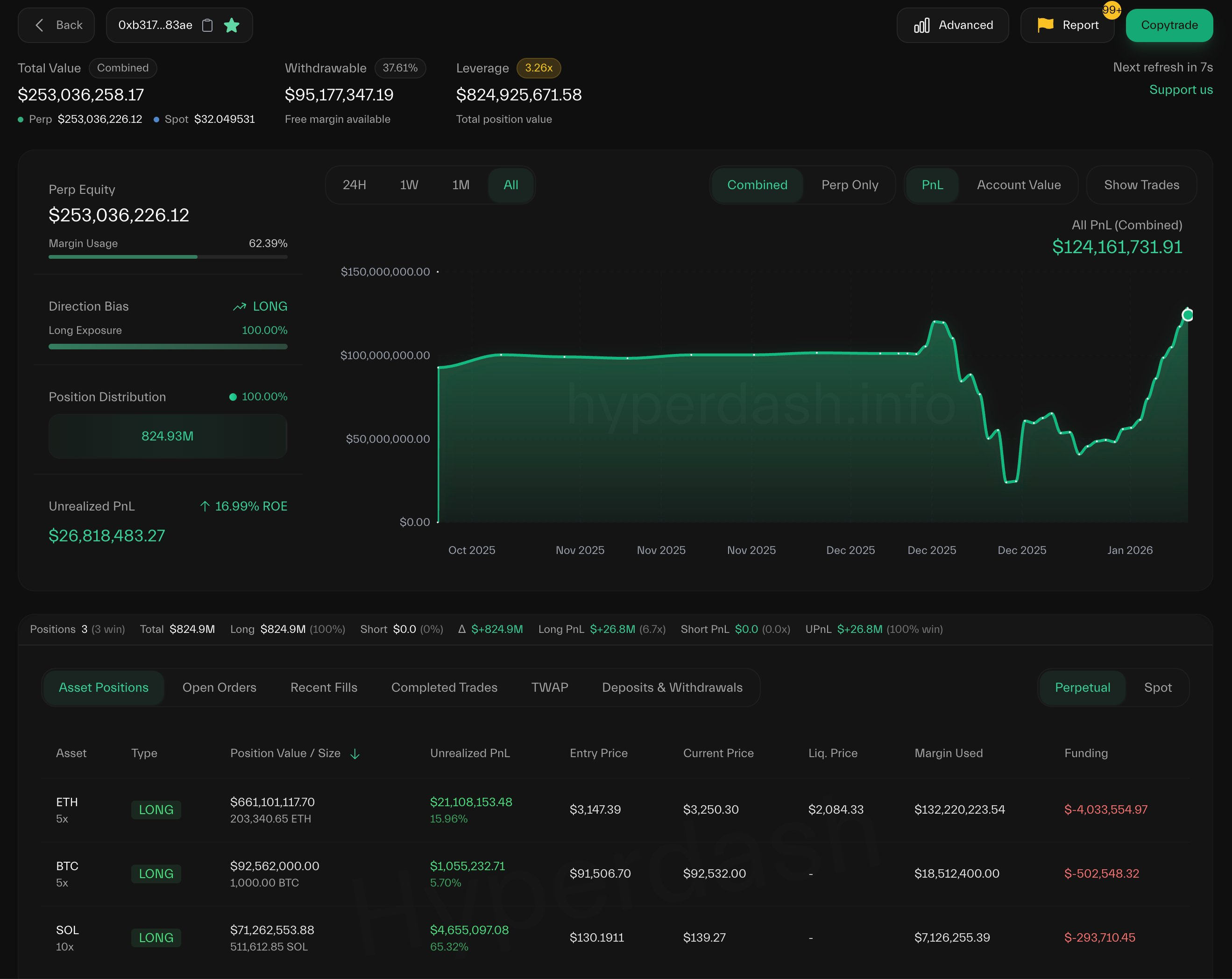 该巨鲸当前持有价值 8.25 亿美元的多头仓位,整体杠杆率为 3.2 倍,包括 20.3 万枚 ETH(6.6 亿美元)多单,开仓价 3147 美元,浮盈 2110 万美元;1000 枚 BTC(9256 万美元)多单,开仓价 91506 美元,浮盈 105 万美元;以及 51.1 万枚 SOL(7126 万美元)多单,开仓价 130.1 美元,浮盈 465 万美元。