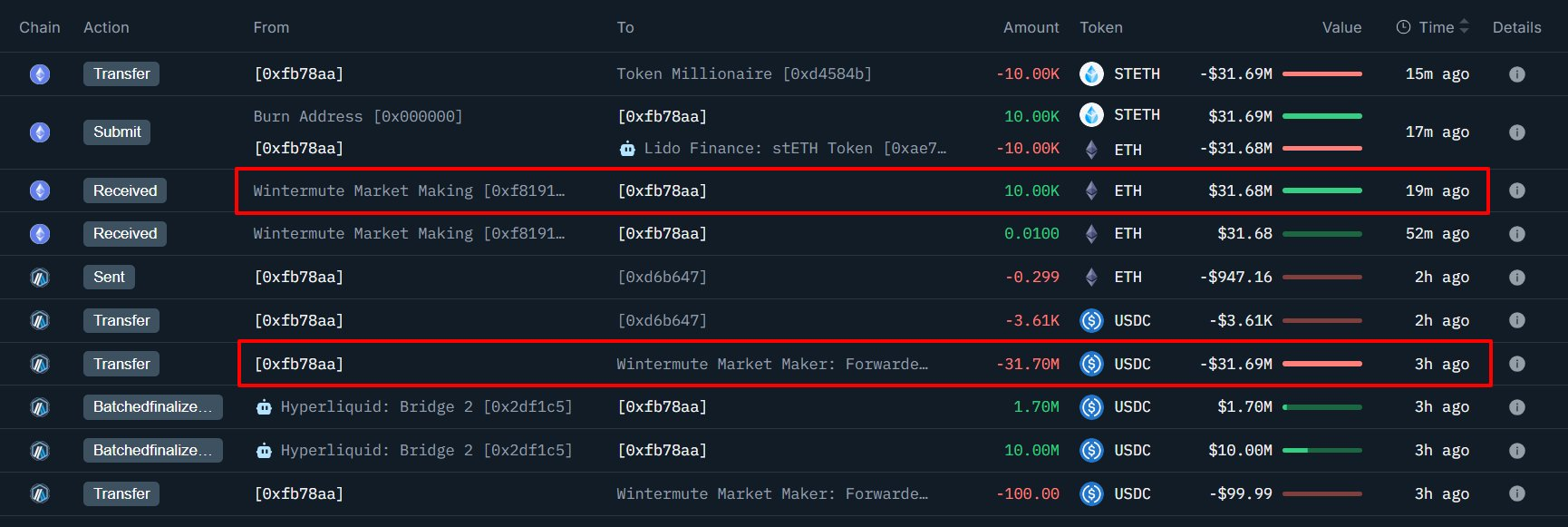 据 OnchainLens(@OnchainLens)监测,地址为"0xfb7"的巨鲸关闭了一个比特币多头头寸,损失约 370 万美元。随后,该巨鲸提取全部资金,并向 Wintermute 存入 3170 万美元 USDC,购买了 10,000 枚以太坊。 该巨鲸后续将这些以太坊转换为 stETH(质押型以太坊),并将其发送至另一个钱包地址。据悉,该钱包目前持有 40,060 枚 stETH,价值约 1.2648 亿美元。