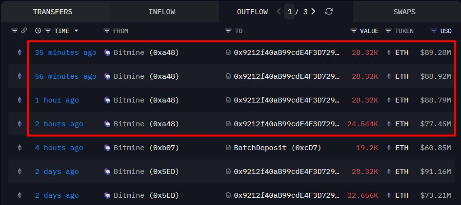据 Onchain Lens(@OnchainLens)监测,Bitmine(@BitMNR)进一步质押了 109,504 枚 ETH,价值约 3.44 亿美元。目前,Bitmine 的以太坊质押总量已达 908,192 枚 ETH,总价值约 29.5 亿美元。