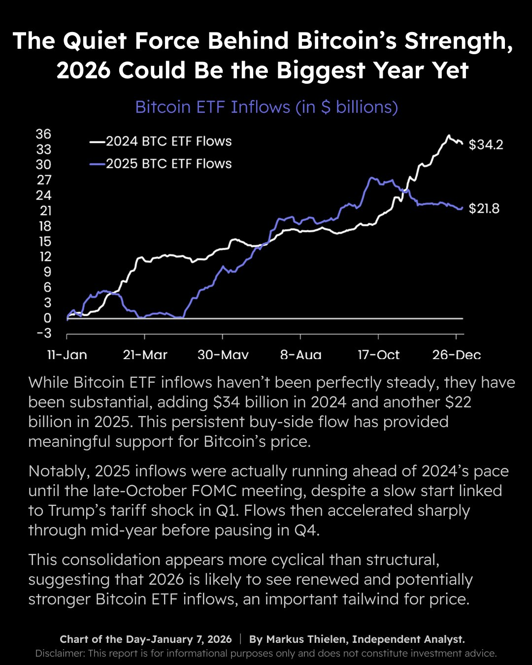 深潮 TechFlow 消息,1 月 8 日,Matrixport 发布今日图表称,“比特币ETF资金流入虽然并非完全稳定,但规模相当可观。2024年累计流入340亿美元,2025年又增加了220亿美元。这种持续的买入需求为比特币价格提供了有力支撑。