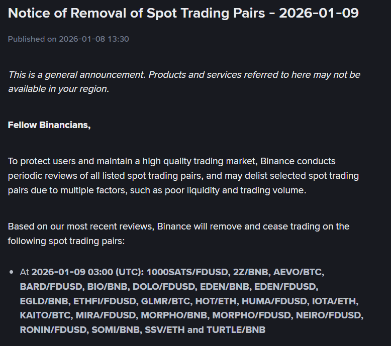 深潮 TechFlow 消息,1 月 8 日,据官方公告,币安将于 1 月 9 日 11:00 移除 1000SATS/FDUSD、2Z/BNB、AEVO/BTC、BARD/FDUSD、BIO/BNB、DOLO/FDUSD、EDEN/BNB、EDEN/FDUSD、EGLD/BNB、ETHFI/FDUSD、GLMR/BTC、HOT/ETH、HUMA/FDUSD、IOTA/ETH、KAITO/BTC、MIRA/FDUSD、MORPHO/BNB、MORPHO/FDUSD、NEIRO/FDUSD、RONIN/FDUSD、SOMI/BNB、SSV/ETH 和 TURTLE/BNB 现货交易对并停止交易。