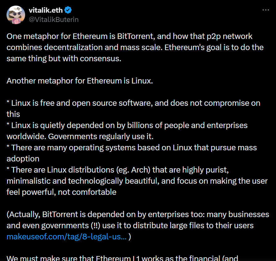 深潮 TechFlow 消息,1 月 8 日,以太坊联合创始人 Vitalik Buterin 在社交媒体发文将以太坊比作 BitTorrent 和 Linux,强调其结合去中心化与大规模应用的特性。他指出,Linux 作为自由开源软件,不仅被全球数十亿用户和企业依赖,还被政府广泛使用。Vitalik 强调以太坊一层网络必须作为个人和组织的金融(最终还包括身份、社交、治理)家园,让用户无需依赖中介机构即可获得网络的全部功能。他认为,这种开放韧性的生态系统能够为大量用户提供价值,同时获得企业的信任与喜爱,因为"我们称之为无需信任,他们称之为审慎的交易对手风险最小化"。