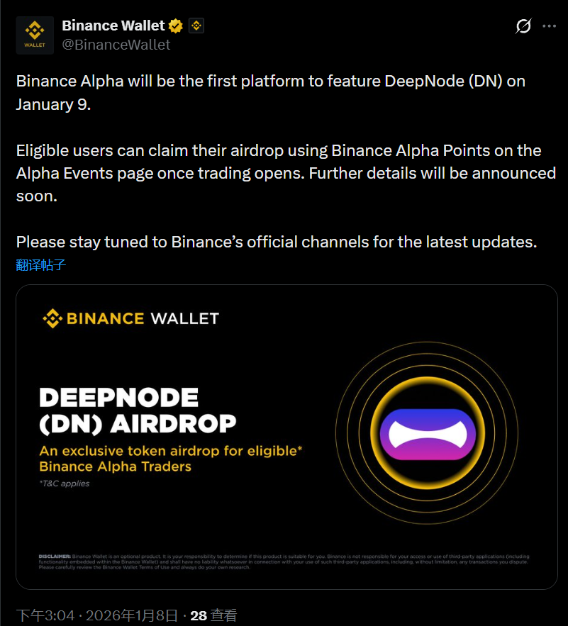 深潮 TechFlow 消息,1 月 8 日,据官方公告,币安 Alpha 将于 1 月 9 日上线 DeepNode (DN)。