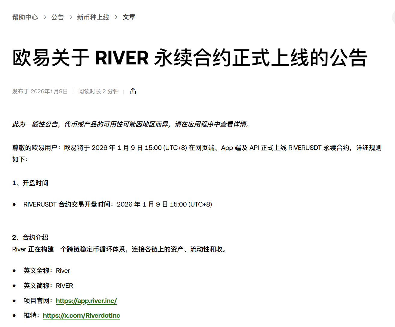 深潮 TechFlow 消息,1 月 9 日,据官方公告,OKX 将于 2026 年 1 月 9 日 15:00 (UTC+8) 在网页端、App 端及 API 正式上线 RIVERUSDT 永续合约,合约交易开盘时间为:2026 年 1 月 9 日 15:00 (UTC+8)。