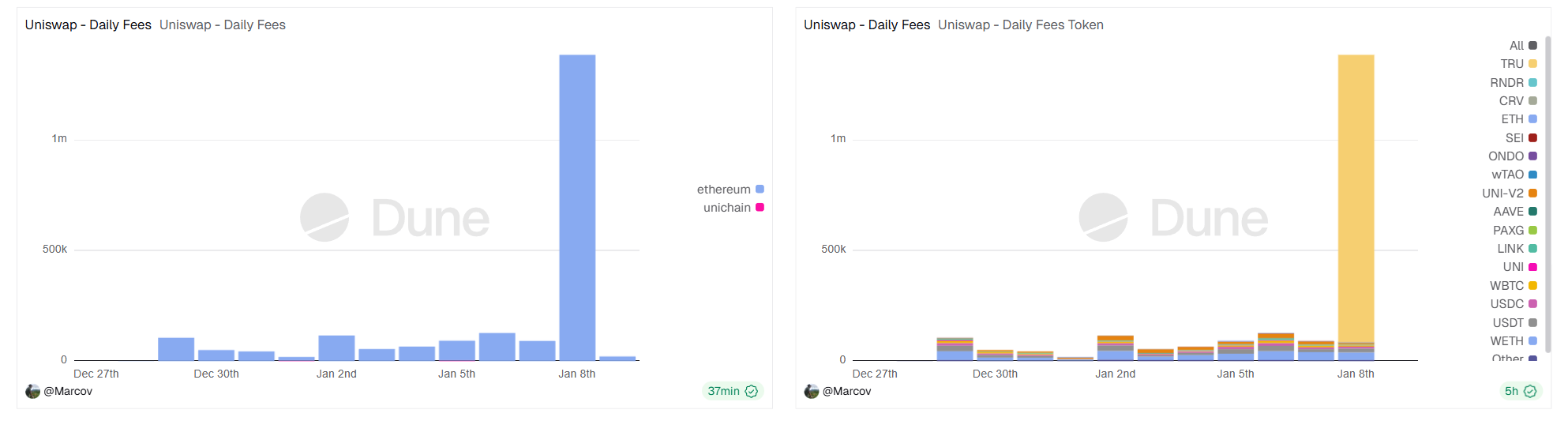 据 Dune 用户 @marcov_91 的数据面板,1 月 9 日,Uniswap 昨日手续费收入达 140 万美元,创下历史新高。 值得注意的是,在 Uniswap 费用捕获的标的中,昨日被黑客攻击的 Truebit Proctocol 代币 TRU 贡献了约 130 万美元。