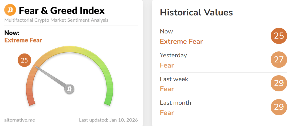 深潮 TechFlow 消息,1 月 10 日,据 Alternative.me 数据,今日加密货币恐慌与贪婪指数降至 25(昨日该指数为 27),表明市场由「恐慌状态」转为「极度恐慌状态」。