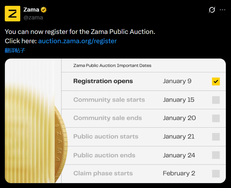 深潮 TechFlow 消息,1 月 10 日,隐私计算项目 Zama Protocol 在社交媒体发文表示,现已对投资者开放 Zama 公售注册。