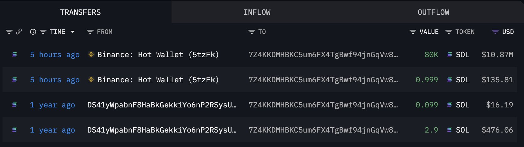 据链上分析平台 Lookonchain(@lookonchain)监测,地址"7Z4KKD"在沉寂一年后,于 5 小时前从币安交易所提取了 8 万枚 SOL(约合 1087 万美元)。