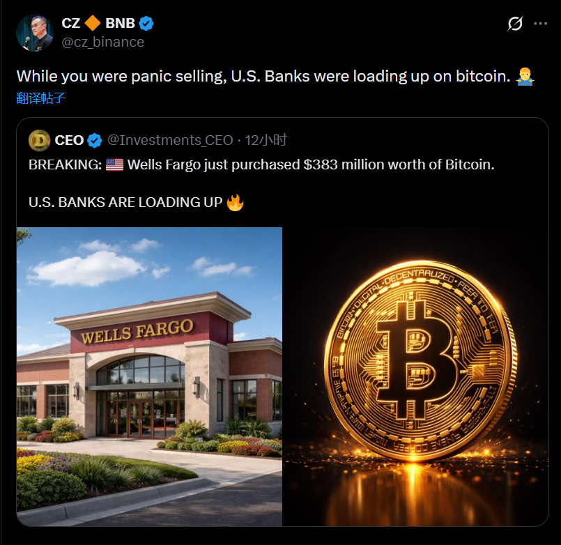 币安创始人 CZ(赵长鹏)转发一则主题为“富国银行刚刚购买了价值 3.83 亿美元的比特币,美国银行正在大举买入”推文,并配文称:“当你在恐慌性抛售时,美国的银行却在持续加仓比特币。”