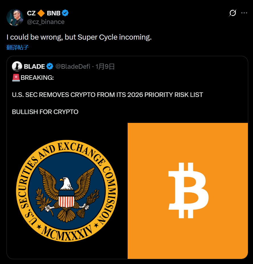 深潮 TechFlow 消息,1 月 10 日, 币安创始人 CZ 转发了一则主题为“美国证监会已将加密资产从其 2026 年重点风险清单中移除,这对加密市场构成明显利好”的推文,配文称:“我也可能判断有误,但看起来超级周期即将到来。”