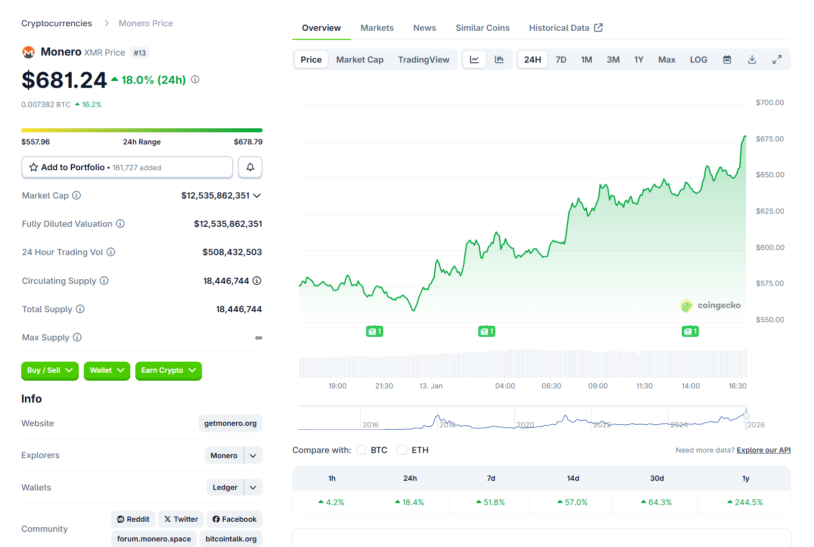 深潮 TechFlow 消息,1 月 13 日,据 Coingecko 行情显示,隐私币 XMR 近 24 小时涨幅约 18%,突破 680 美元,续创历史新高。