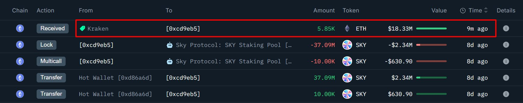 深潮 TechFlow 消息,1 月 13 日,据 OnchainLens(@OnchainLens)监测,某鲸鱼从 Kraken 交易所提取了 5,894 枚 ETH,价值约 1,833 万美元。该鲸鱼在上周还提取了 3,709 万枚 SKY 代币(价值约 233 万美元),并将其转入质押。