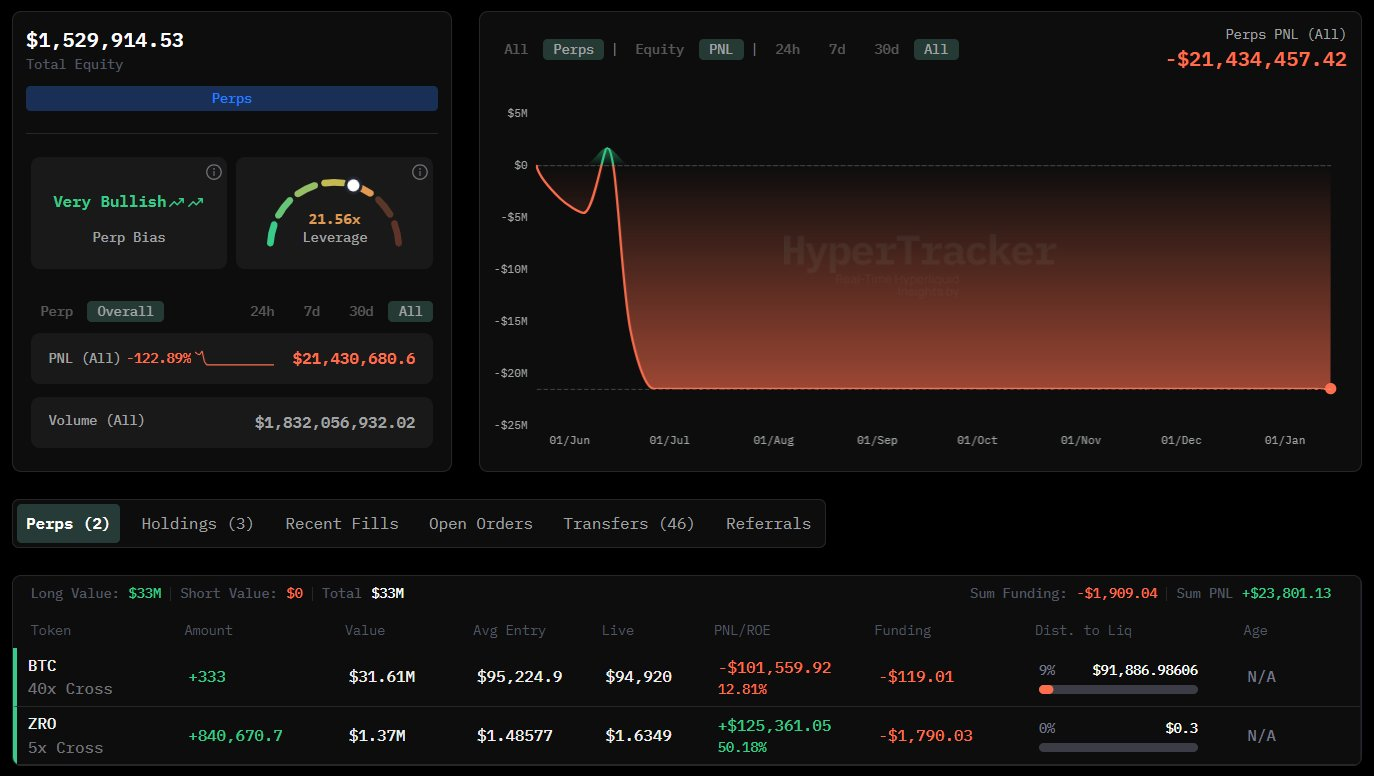 据 OnchainLens 监测,一名鲸鱼向 HyperLiquid 存入了 107 万美元 USDC,并开设了一个比特币多头仓位,使用 40 倍杠杆,当前价值约 3161 万美元。 该鲸鱼同时持有一个 ZERO 代币 5 倍杠杆多头仓位,目前浮动盈利约 12.5 万美元。据记录,该鲸鱼此前在交易中已累计亏损约 2140 万美元。