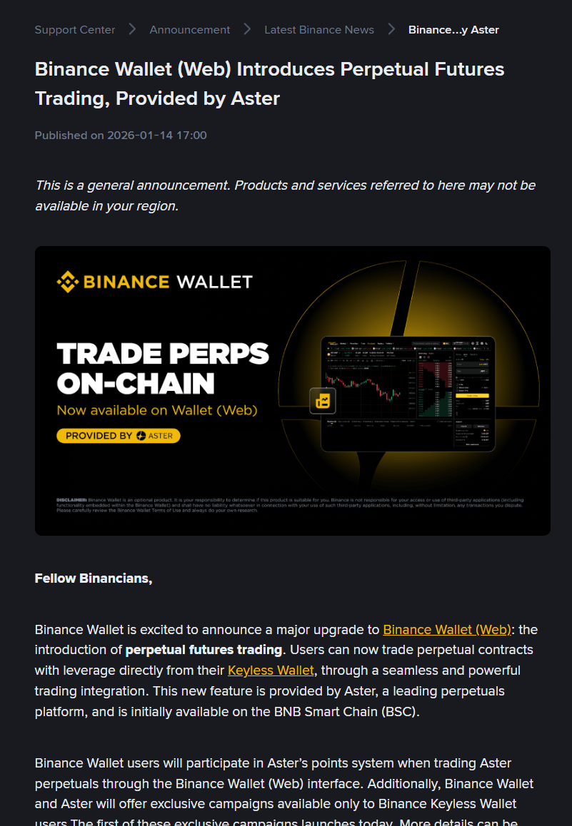 深潮 TechFlow 消息,1 月 14 日,据官方公告,币安钱包网页版现已支持永续期货交易功能,该功能由 Aster DEX 提供支持。