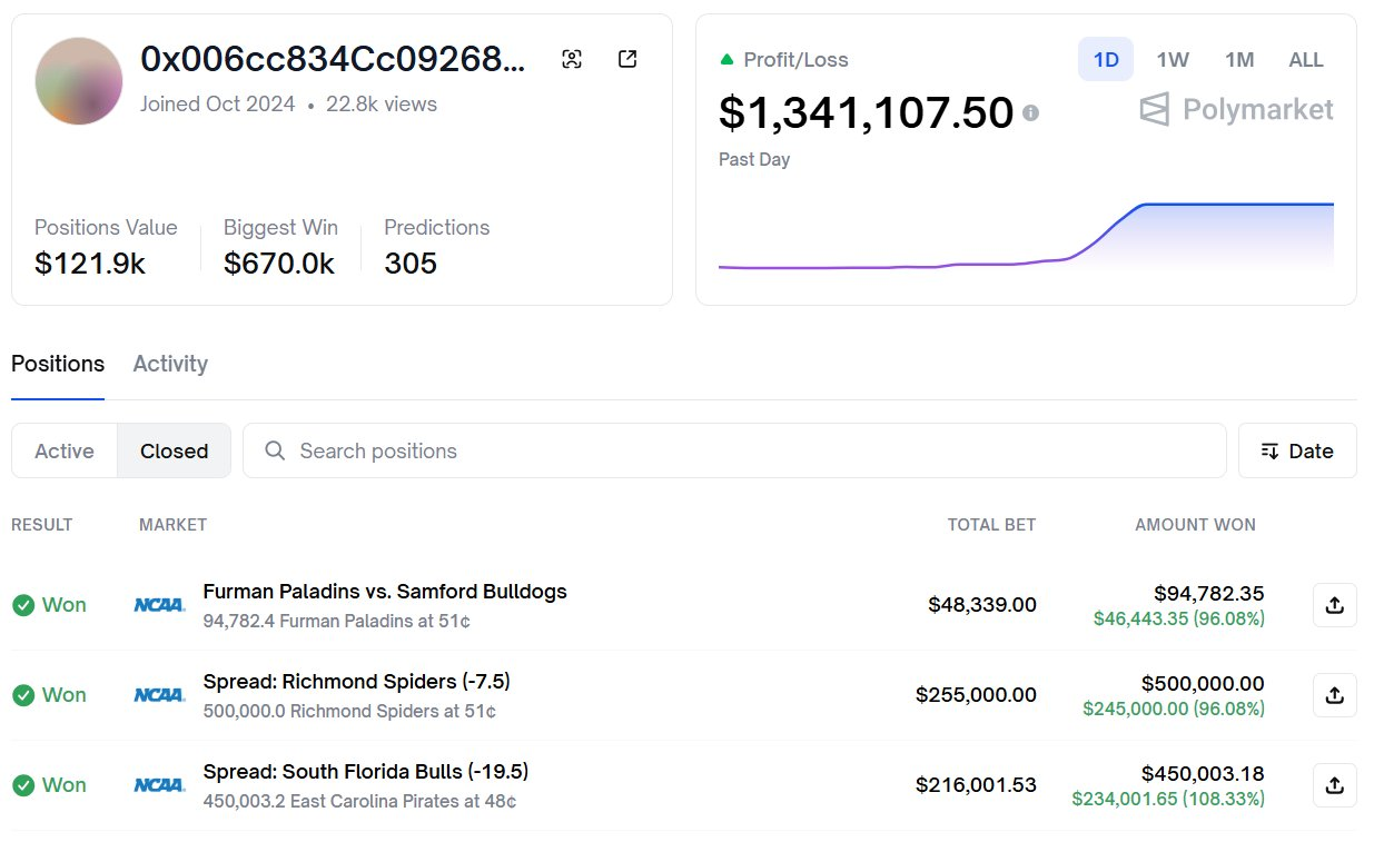 据 OnchainLens(@OnchainLens)监测,预测市场平台 Polymarket 上的交易员 "0x006" 在过去 24 小时内获利 134 万美元,该交易者累计盈利已超过 380 万美元。
