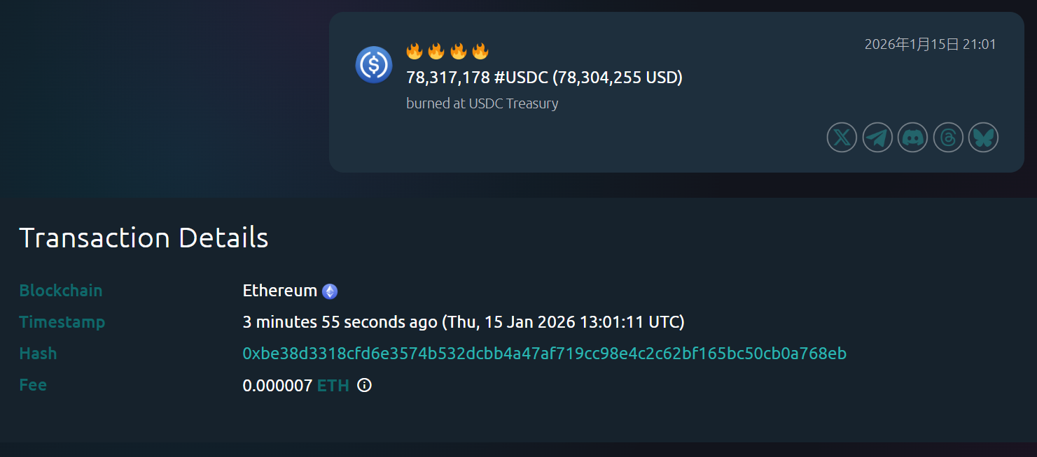 深潮 TechFlow 消息,1 月 15 日,据 Whale Alert(@whale_alert)监测,USDC Treasury 在以太坊链上销毁 78,317,178 枚 USDC。