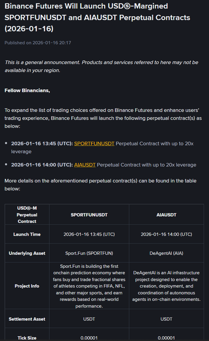 深潮 TechFlow 消息,1 月 16 日,据官方公告,币安将于 1 月 16 日上线 SPORTFUN 和 AIA 的 USDT 永续合约。