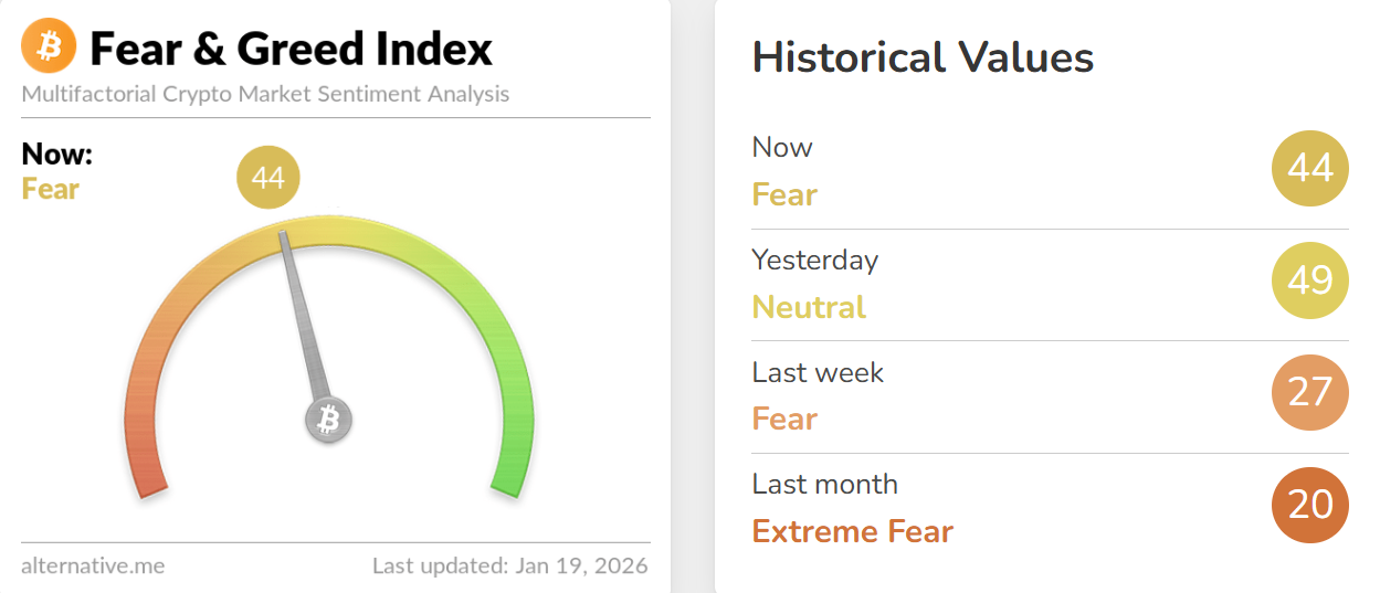 深潮 TechFlow 消息,1 月 19 日,据 Alternative.me 数据,今日加密货币恐慌与贪婪指数降至 44(昨日该指数为 49),表明市场由「中性状态」转为「恐慌状态」。