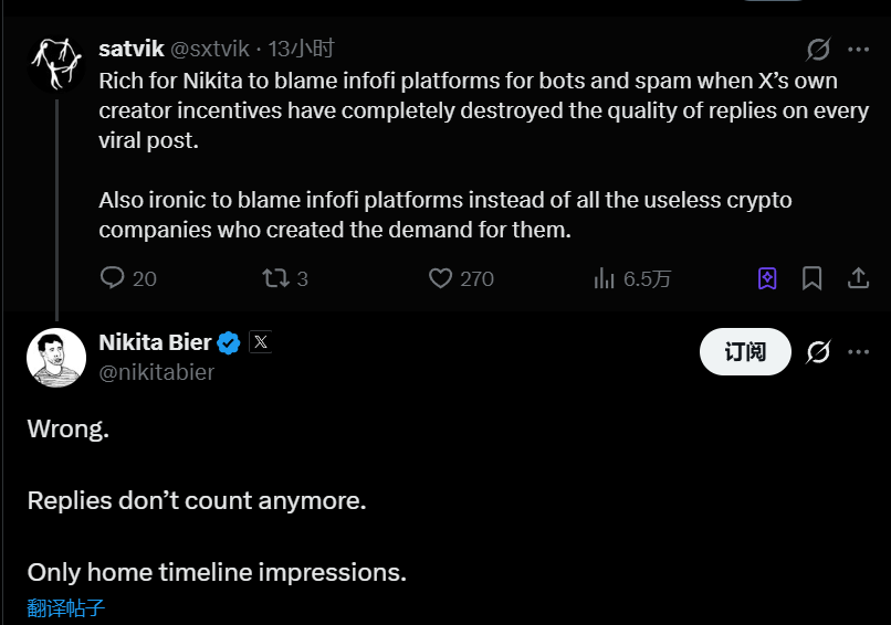 此言论是对 X 用户 satvik 的回应,后者曾批评 Nikita Bier 将机器人和垃圾信息问题归咎于 InfoFi 平台,而忽视了 X 平台自身的创作者激励机制对回复质量的负面影响。