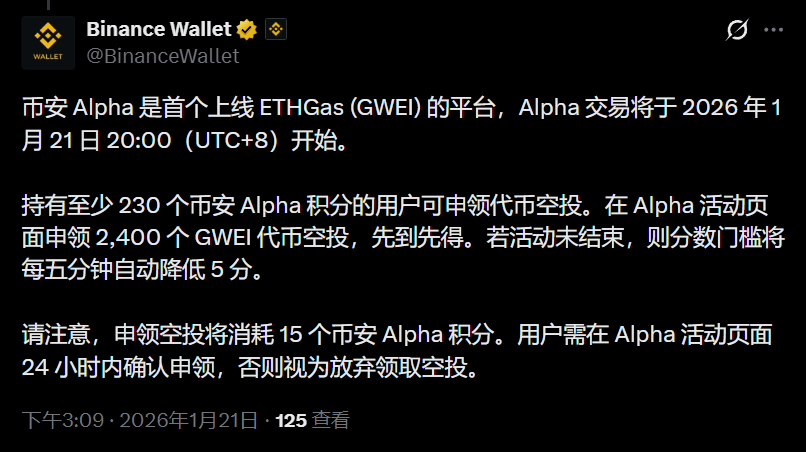 深潮 TechFlow 消息,1 月 21 日,据官方公告,币安 Alpha 是首个上线 ETHGas (GWEI) 的平台,Alpha 交易将于 2026 年 1 月 21 日 20:00(UTC+8)开始。