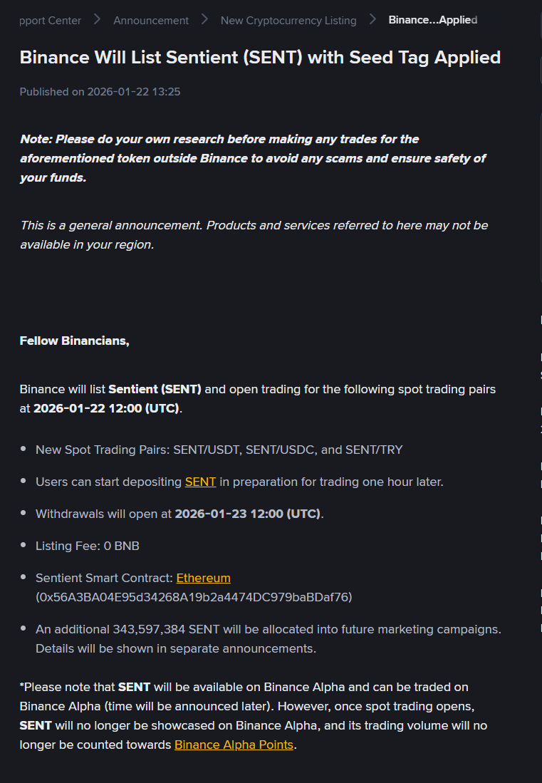 据官方公告,币安将上线 Sentient(SENT) 并为其添加种子标签。